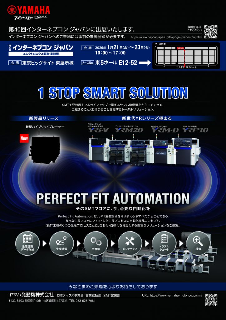 ◆日程:1/21(水)~1/23(金) 10:00~17:00◆場所:東京ビッグサイト(東京都江東区有明3-11-1)東5ホール E12-52 ヤマハ発動機の最新設備を豪華出展!!SMT工程の主要設備をご検討の方は、ぜひご来場くださいませ♪ 当社もアテンドしておりますので、ご来場予定の方は連絡をお待ちしております!